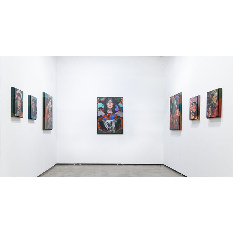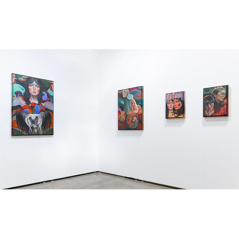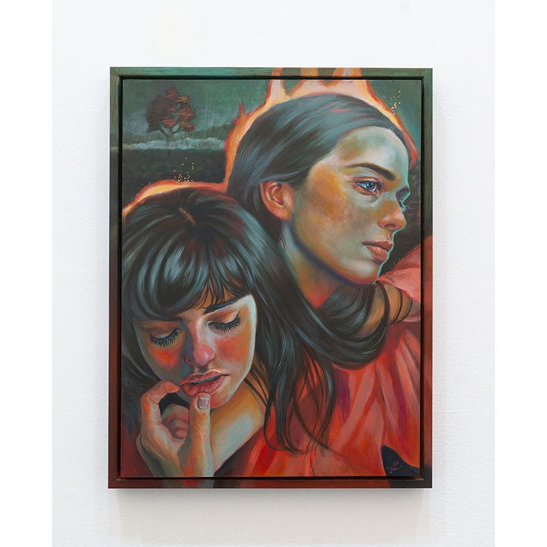 Martine Johanna’s work represents an investigation into image versus self-image and the ever changing, multifaceted role of women within a patriarchal culture. Her semi-autobiographical imagined female characters are placed within surreal surroundings, free to be erratic, elusive, and independent. Engulfed in dark, saturated, and fiery colors, each character embodies a heroic saga, powerfully and fiercely occupying the role of a protagonist that is holding on tightly to the fearless illusions of a dreamer. With visual references to Joan of Arc, Johanna paints heroines who are unapologetic, courageous, and rife with self-affirming power, not to be oppressed by traditional perspectives of male superiority. Through the bravery projected by each fantastical scene, Johanna’s paintings create visionary worlds that are safe from ridicule and judgment, celebrating women who exist within their own power.